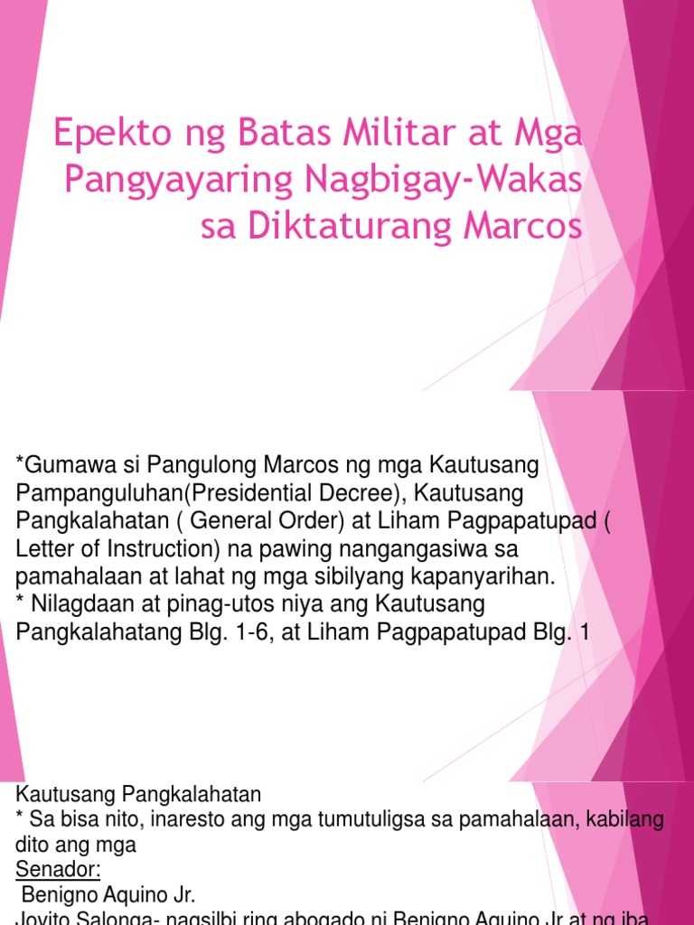 The manila international airport was later renamed ninoy aquino international airport in his honor and the anniversary of his death is a national holiday in the philippines. Mula sa pagiging standar bearer ng kanyang partido ay sa isang iglap naging isang preso ito. Benigno simeon aquino aquino, jr. Iprinoklama ang batas militar sa bisa ng kautusang ito. Matagal nang tapos ang batas militar.